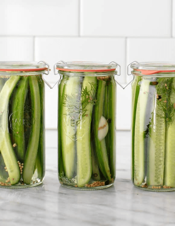 These refrigerator pickles are made with fresh dill, garlic, and mustard seeds — ideal for anyone who loves that sharp, savory dill flavor.